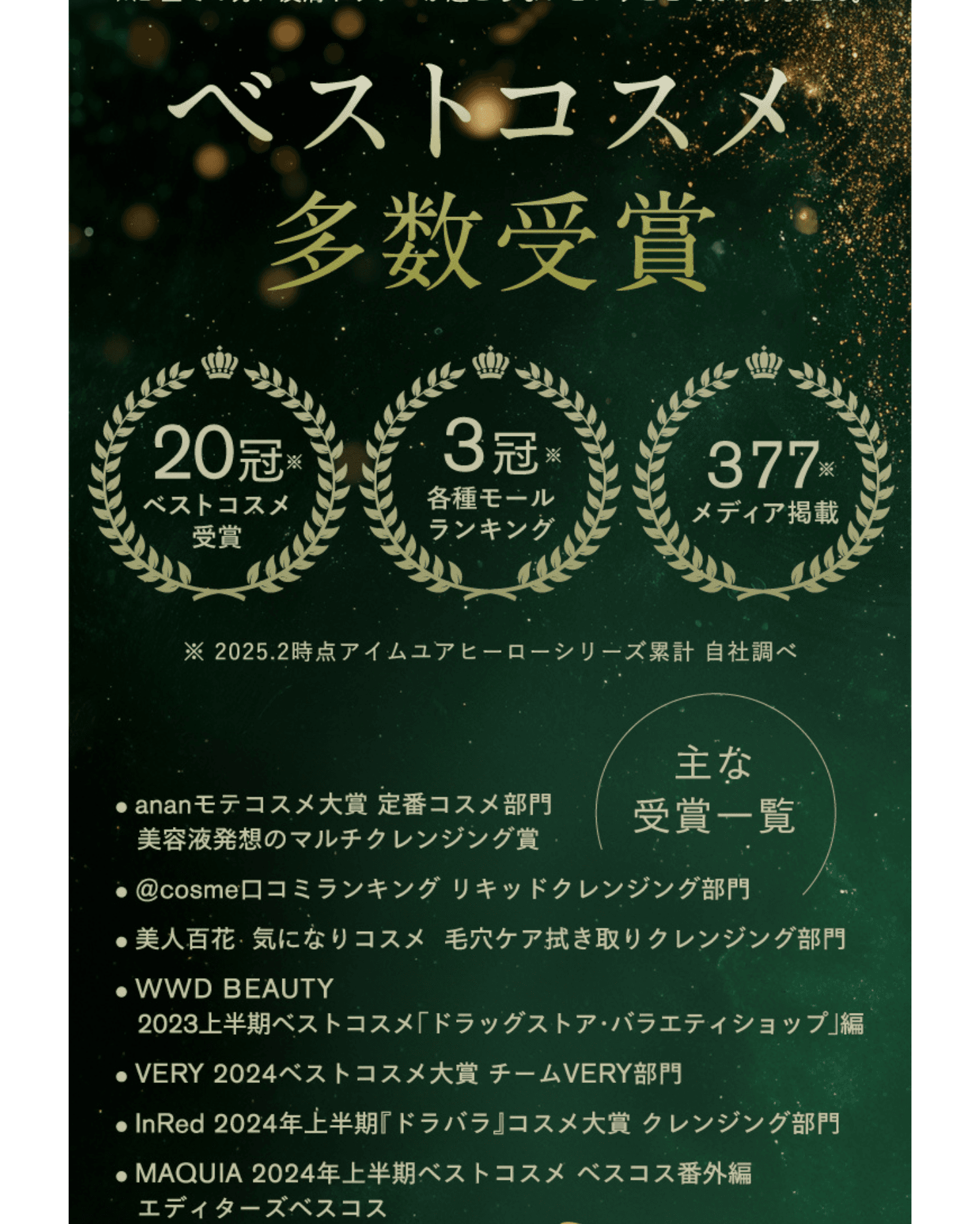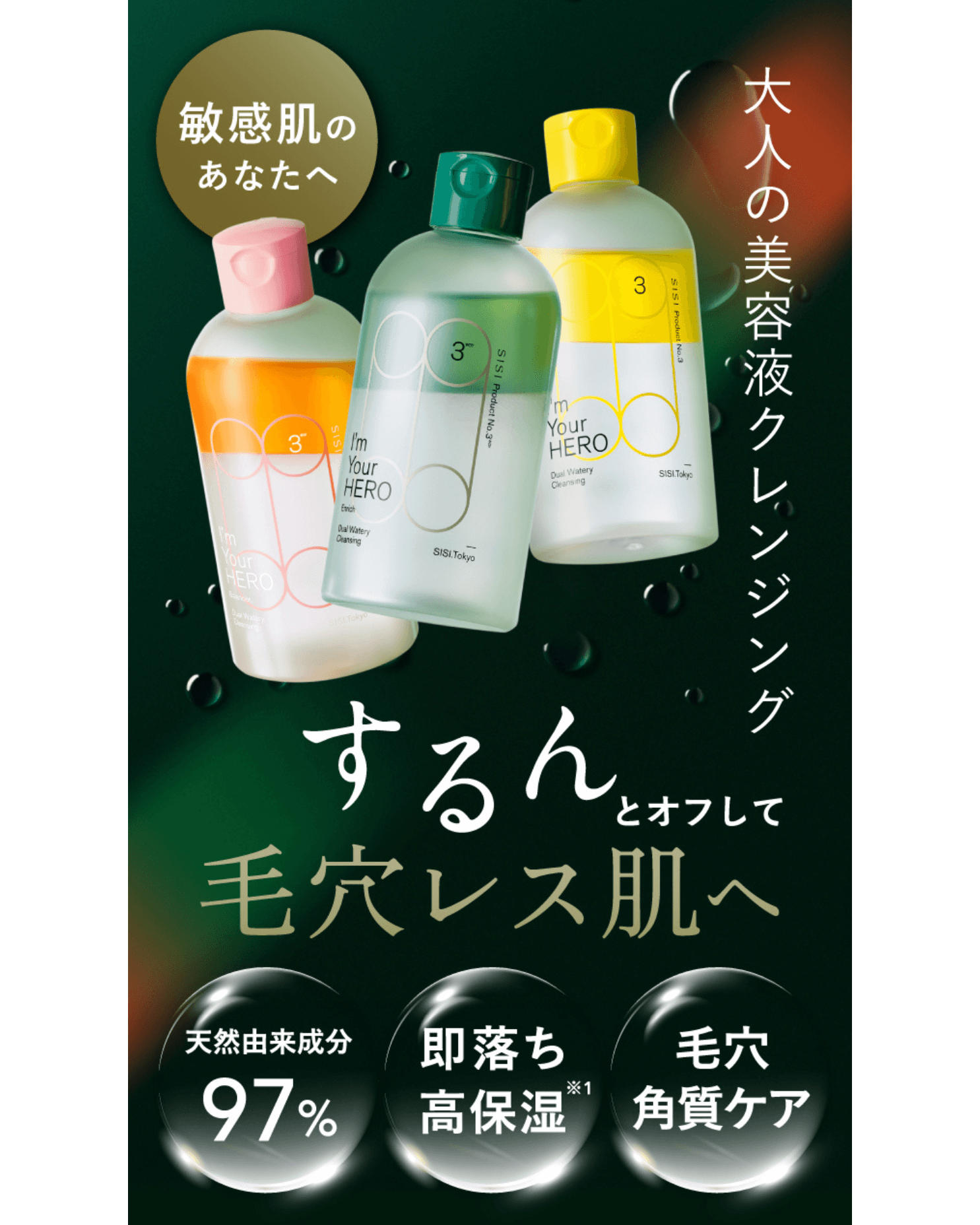 ・天然由来成分97% ・即落ち高保湿 ・毛穴角質ケア ・ニ層式クレンジングウォーター ・W洗顔不要 ・摩擦レス ・アルコールフリー ・敏感肌パッチテスト済み